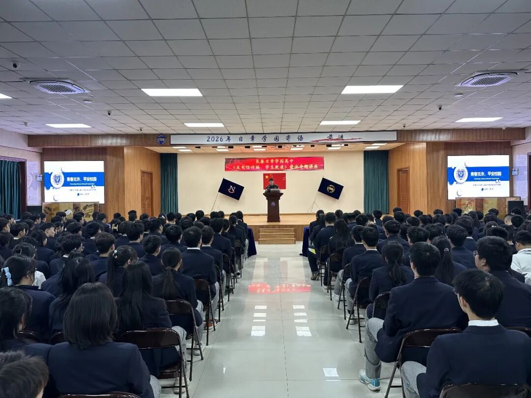 春风和煦,万物向新。为切实增强学生法治观念、安全防范与自我保护能力,有效预防电信网络诈骗与学生欺凌事件,营造安全、文明、和谐的校园环境,2026年3月17日下午,长春日章学园高中在校礼堂隆重举办“反电信诈骗、学生欺凌”普法专题讲座。讲座由学校政教处主任王文赫主持,特邀长春市公安局二道区分局反诈骗中心赵欣警官、吉林街派出所林百利所长出席,为全体师生带来了一堂生动而深刻的法治安全课。