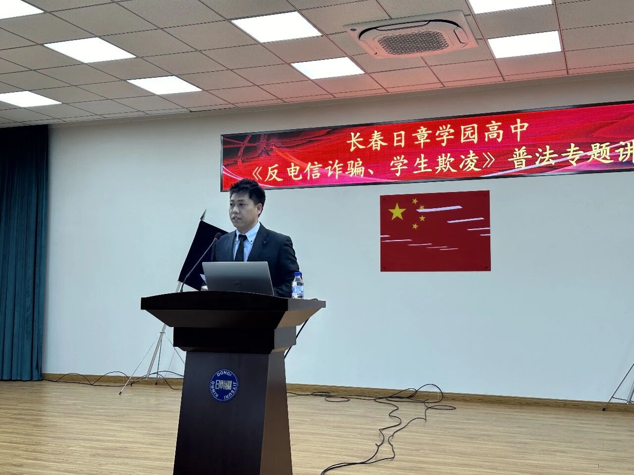 春风和煦,万物向新。为切实增强学生法治观念、安全防范与自我保护能力,有效预防电信网络诈骗与学生欺凌事件,营造安全、文明、和谐的校园环境,2026年3月17日下午,长春日章学园高中在校礼堂隆重举办“反电信诈骗、学生欺凌”普法专题讲座。讲座由学校政教处主任王文赫主持,特邀长春市公安局二道区分局反诈骗中心赵欣警官、吉林街派出所林百利所长出席,为全体师生带来了一堂生动而深刻的法治安全课。