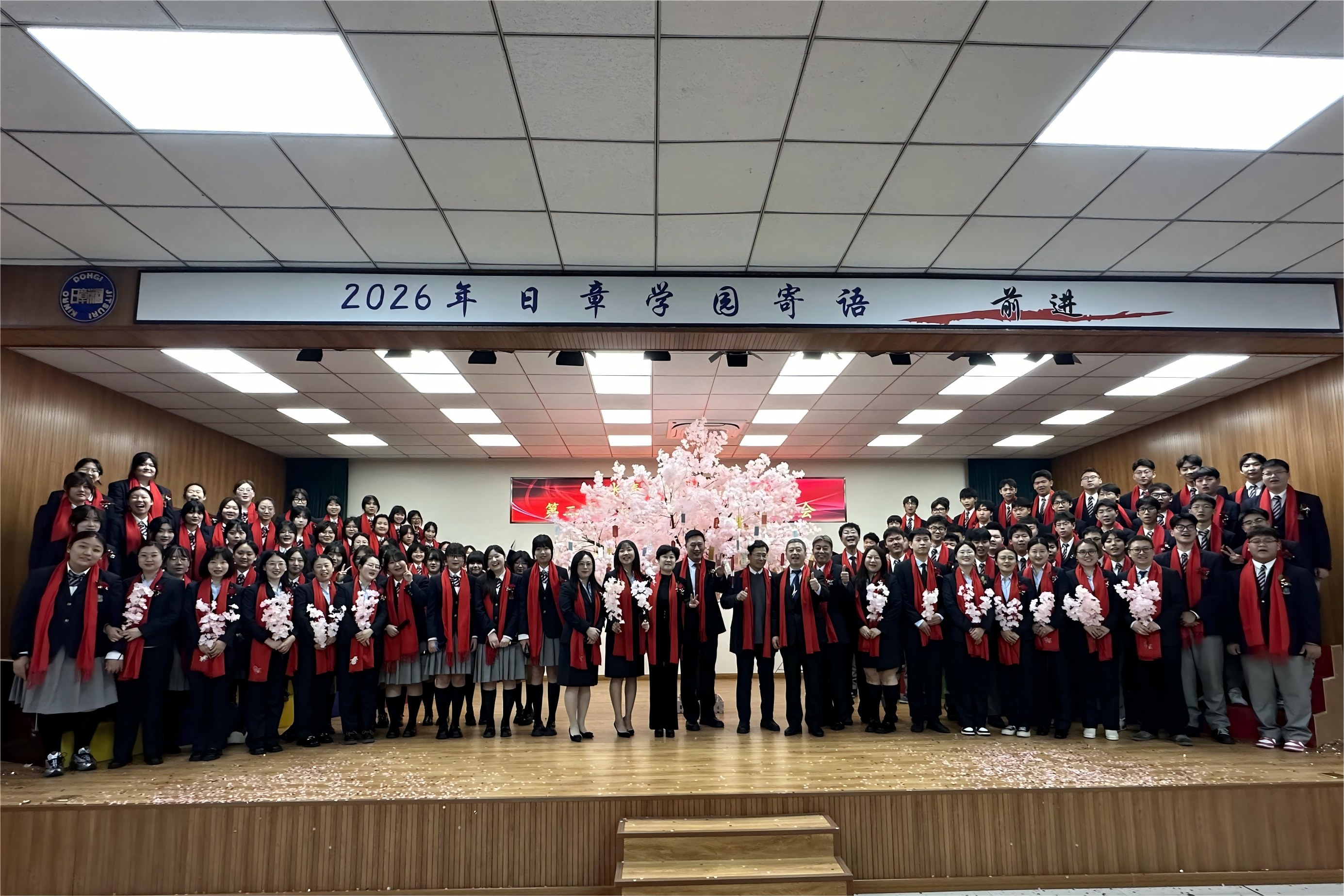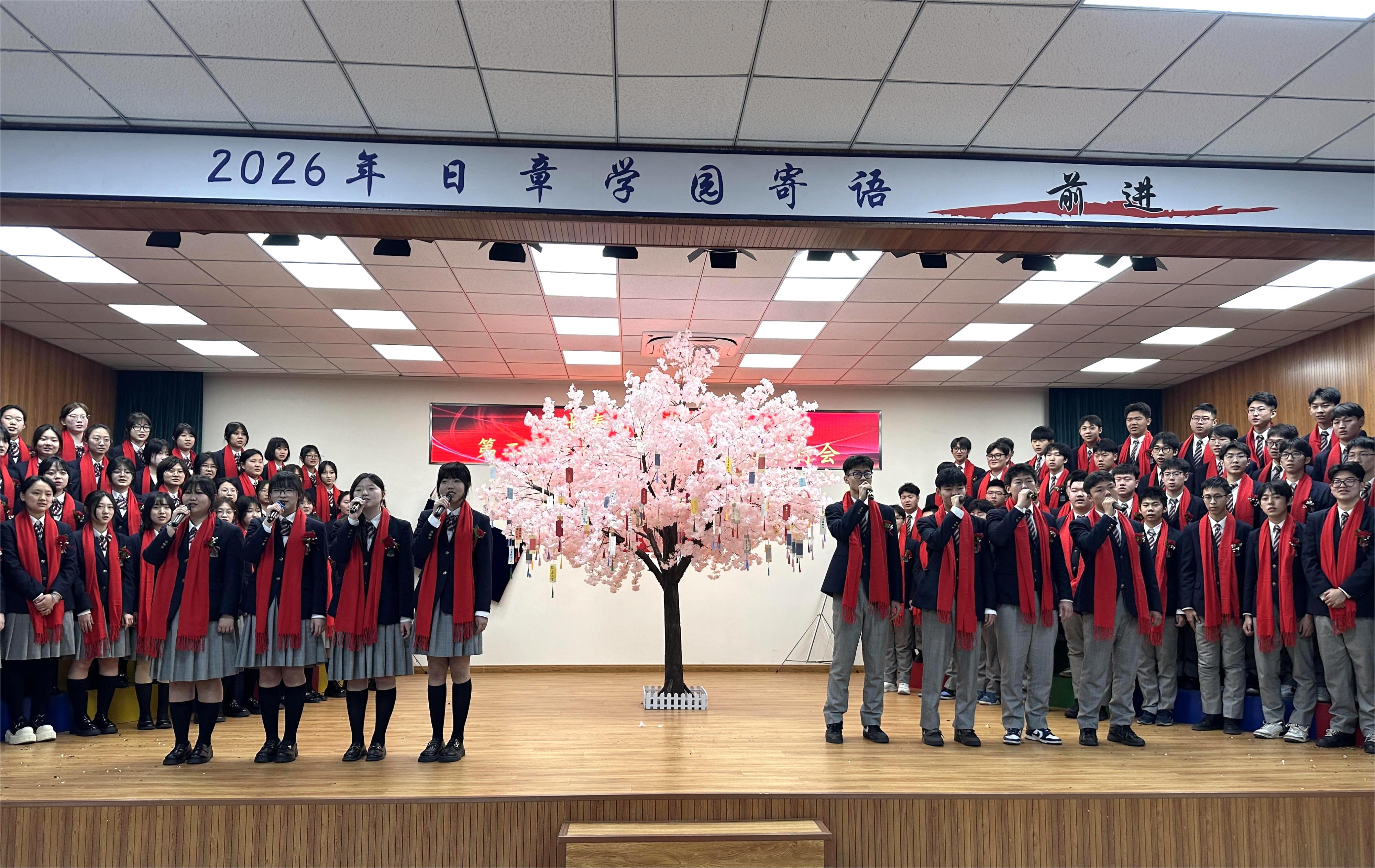 一纸心愿凝初心,满树繁花映前程。国际班学子们手持写有理想大学与青春心愿的卡片,郑重悬挂在樱花树上,一张张卡片,是对未来的约定,是青春最动人的誓言。随后校领导和班主任登台,将母校的祝福与期盼悬挂于樱花枝头,为学子们的征途点亮星光。